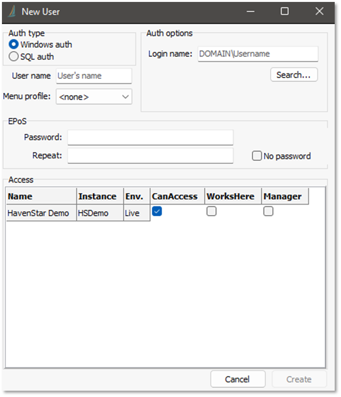 4) If using Window auth, you can search for the login name from the Search... button in the Auth options section on the right-hand side (This will also then auto populate User name). if using SQL auth, you will need to enter a Login name & password. Then add the User name (defaults to their login name if not set) and select the appropriate Menu profile.