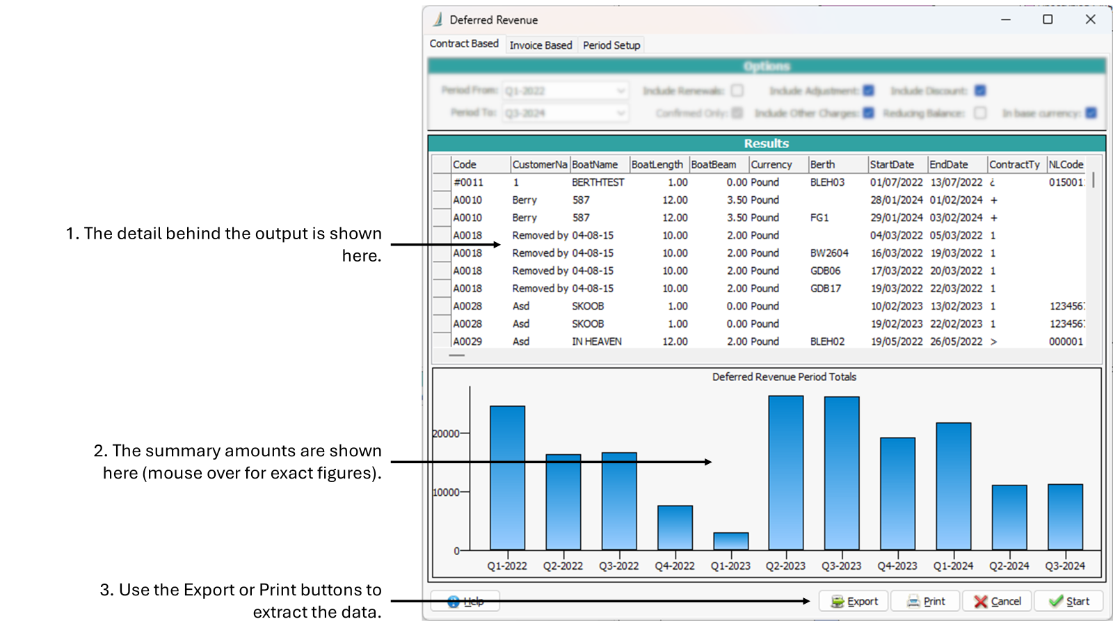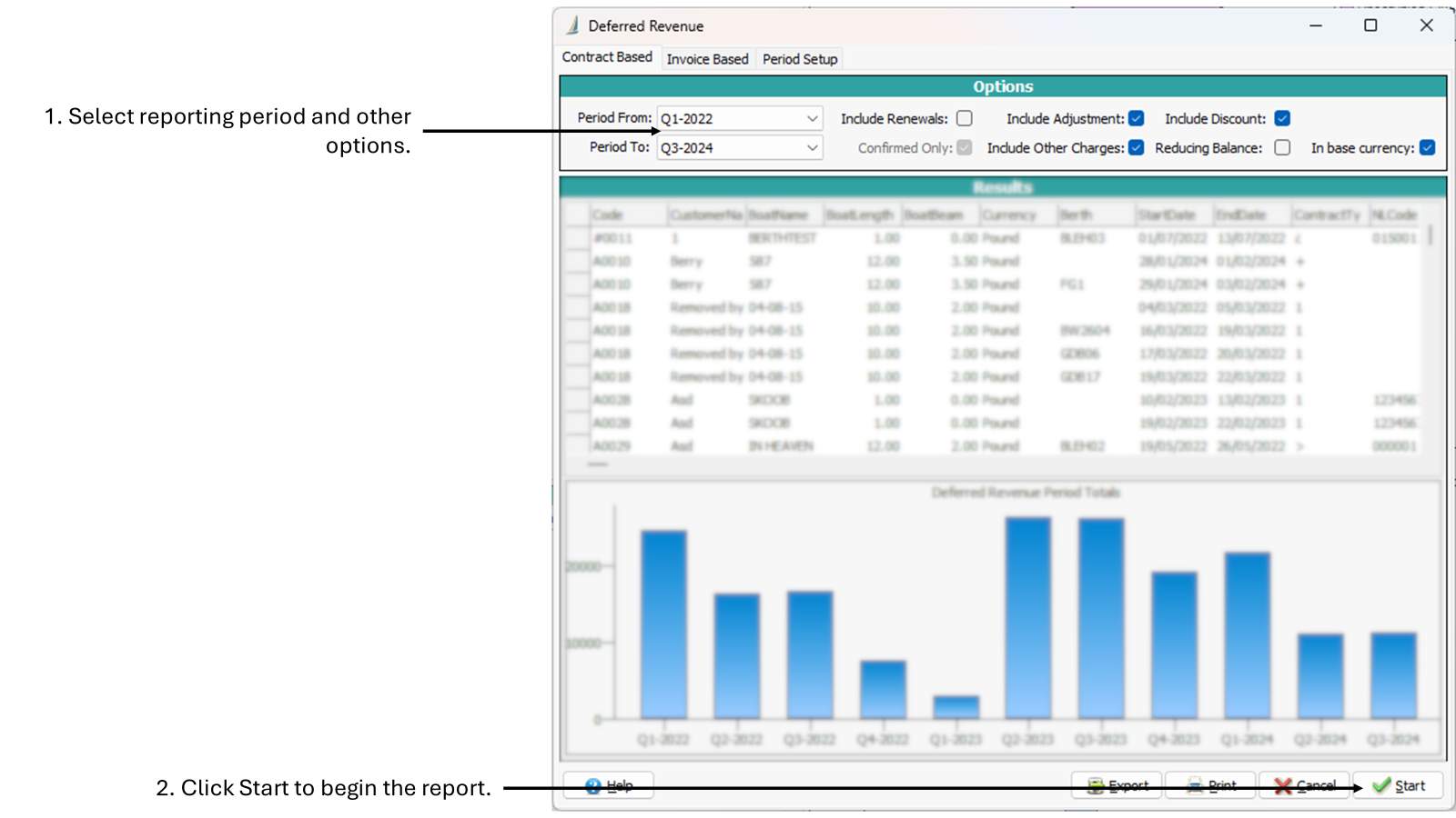 The standard deferred revenue report forecasts expected revenue recognition. It can do this either based on invoices that have been raised, or based on existing mooring contracts, regardless of invoicing state.