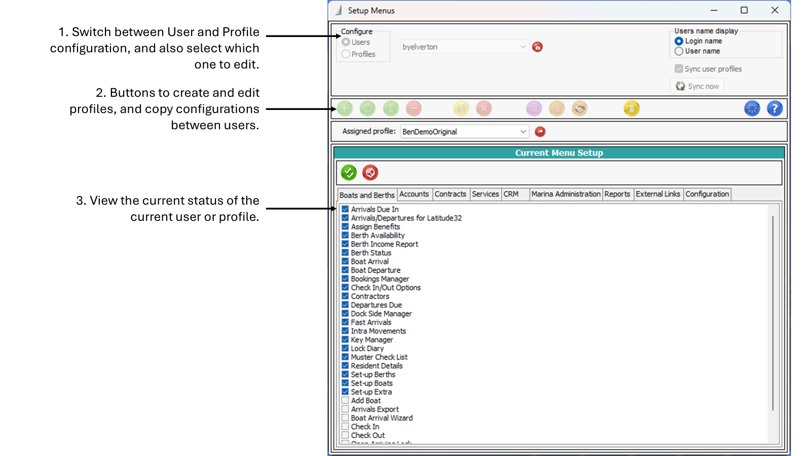 To edit a profile, switch to Profile mode using the options in the top-left of the screen; then select the Profile that you want to edit. Editing a Profile is basically the same as editing a user - simply tick or untick the menu items that should be allocated to that profile. You can also Create and Delete profiles using the action buttons in the middle bar.