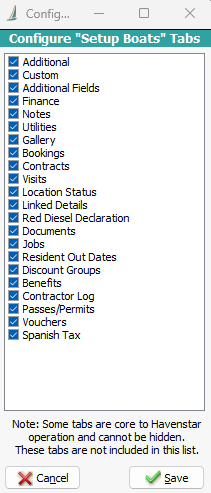In Havenstar, there is the ability to show/hide tabs in Set-up Boats (F10) so that you only display tabs that you require.