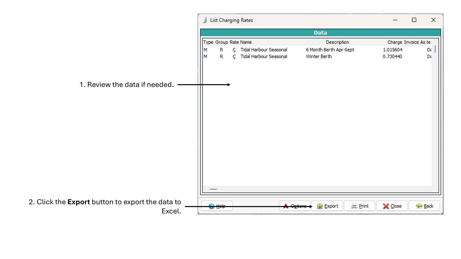 If you simply want to update and overwrite the current prices, you can do this by editing the Charge column directly. This column indicates the tax-inclusive rate for that particular band. Note that the new prices will be applied immediately after you import them, for any new mooring that is billed.