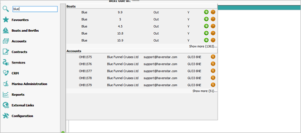The Nav Bar search function automatically searches for different records based on what's typed in. It can be used to find boats, accounts, invoices, and also Havenstar screens/functions.