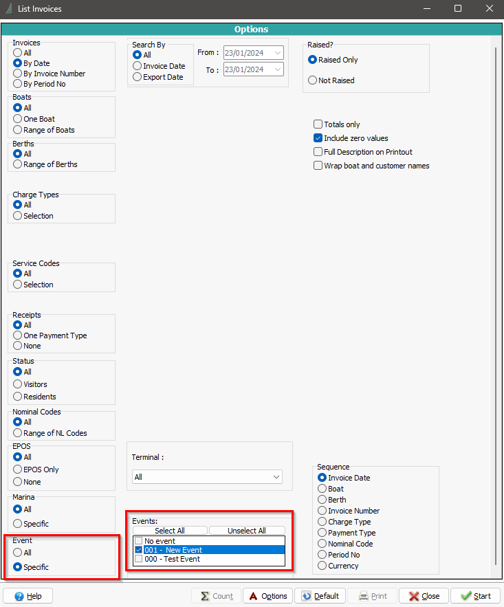 Event tags are shown alongside the associated invoice(s) in the List Invoices report. To filter the report and display only invoices associated with a particular event, use the radio box labelled Event and the checklist to select the event(s) that you want to see. Click Start to begin the report as usual.