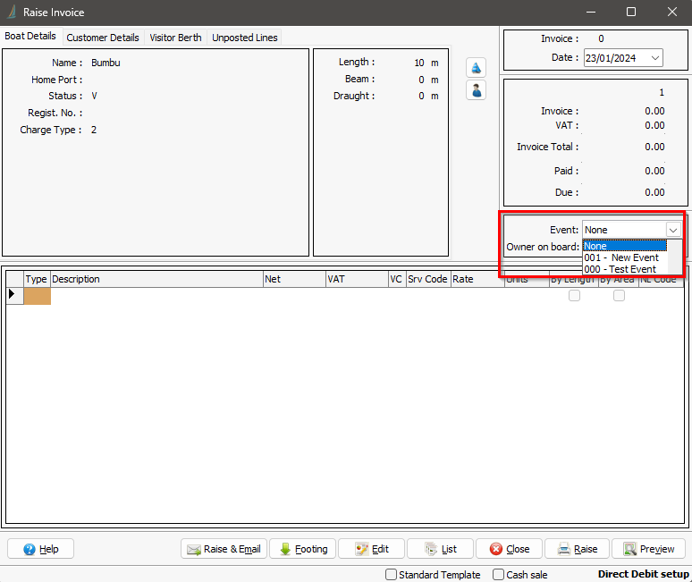 To add an event to an invoice, select the event from the drop-down box labelled "Event" on the Raise Invoice screen, and then proceed to raise the invoice as normal.