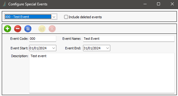 To find and edit an existing event, use the drop-down box at the top of the Special Event Configuration screen to find the event that you want to edit. Then, make any changes required, and click the yellow disk button to Save your changes.